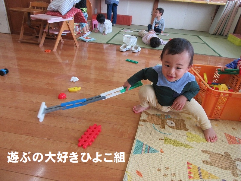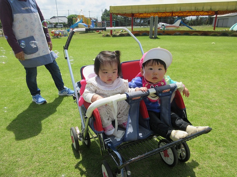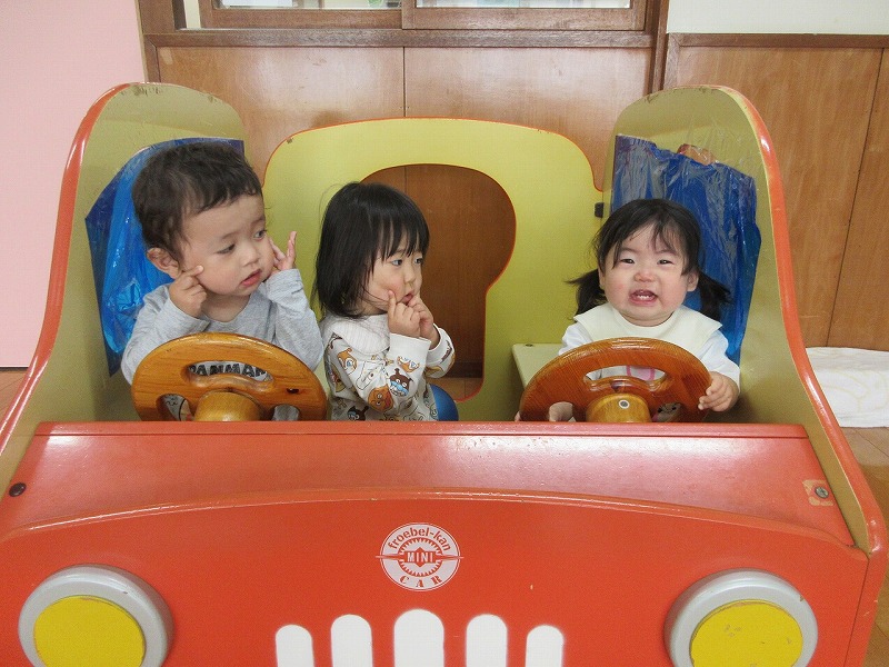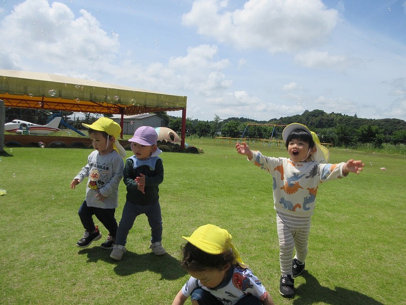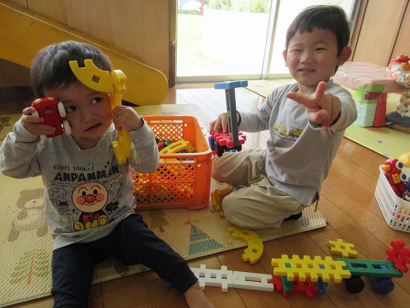 新年度が始まり2ヶ月が経ち、お部屋の中でも好きな玩具、遊びが見られるようになってきました。おままごとでは包丁でトントン…お料理をしたり、食べ物を運んでごちそうしてくれます。ブロックを組み合わせて形にするのも上手になってきました。車や掃除機を作って夢中になって遊んでいます。大きな車に乗って「ブーブー!」と運転するのも大好き!遊びの中で、友だちや保育者とのやりとりも楽しんでいる子ども達です。天気の良い日にはシャボン玉遊びも大人気です!