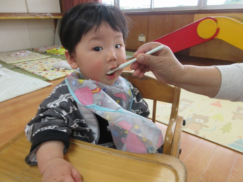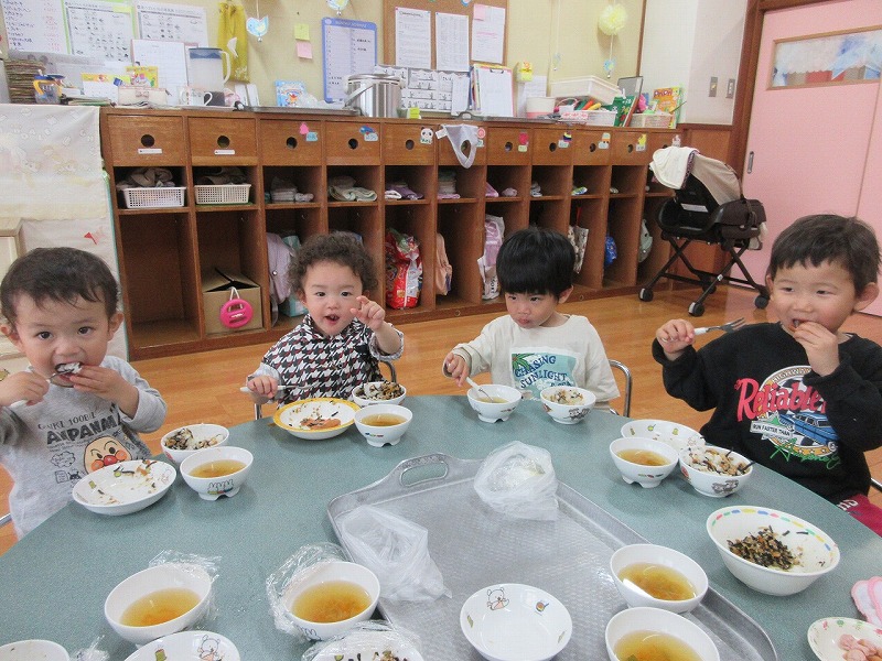 たくさん遊んだ後は大好きな給食の時間!楽しい雰囲気の中で、スプーンやフォークを使って意欲的に食べる姿、大きなお口でモリモリ食べる姿に私たち保育者もパワーをもらっています。たくさん食べて大きくなりますように…! |