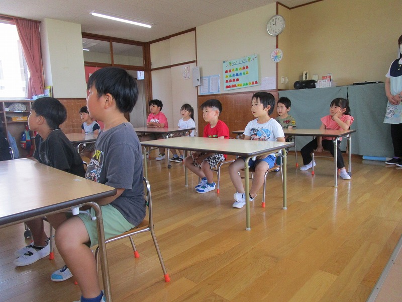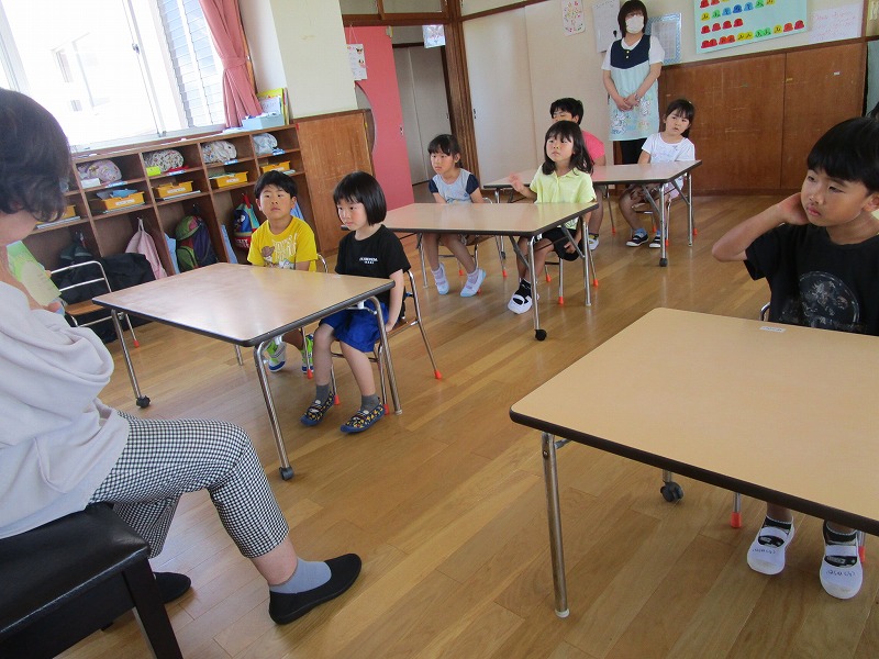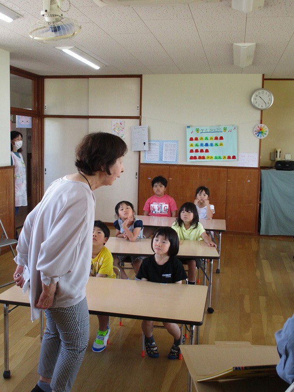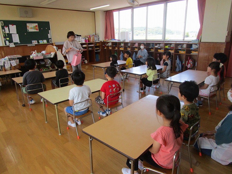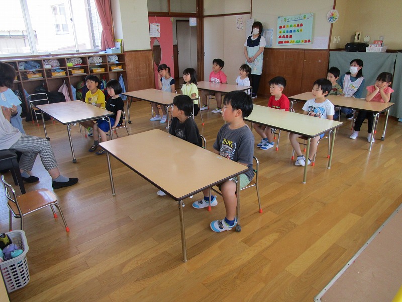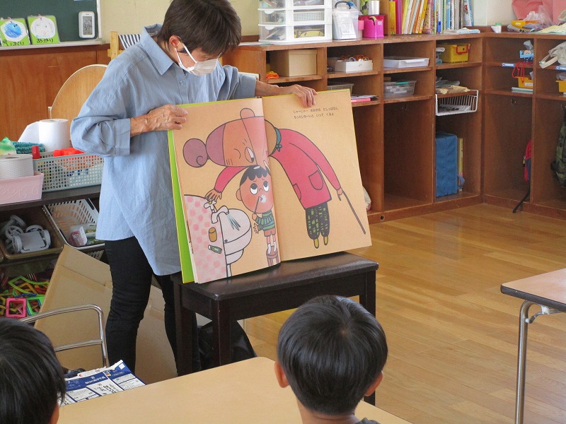 「おしえてくもくん」のお話を聞き、自分の体は人に見せてはいけないことを学ぶ機会となったように思います。大型絵本も用意して下さったので絵本の大きさに驚き、内容も楽しんで見ていました。