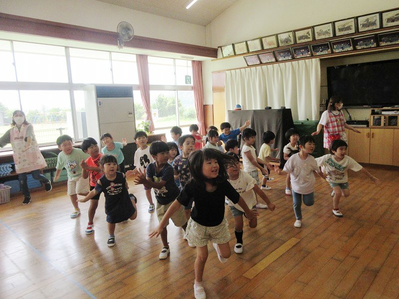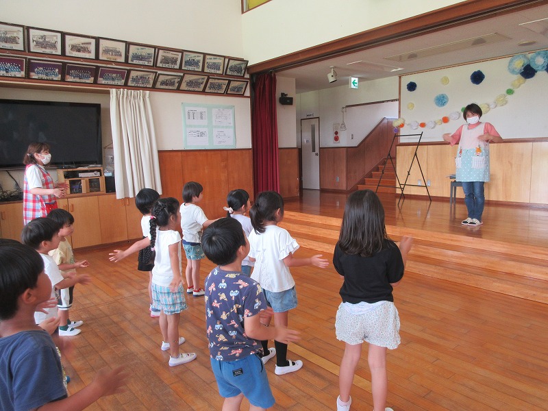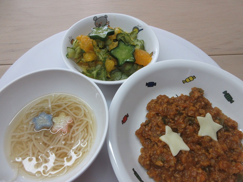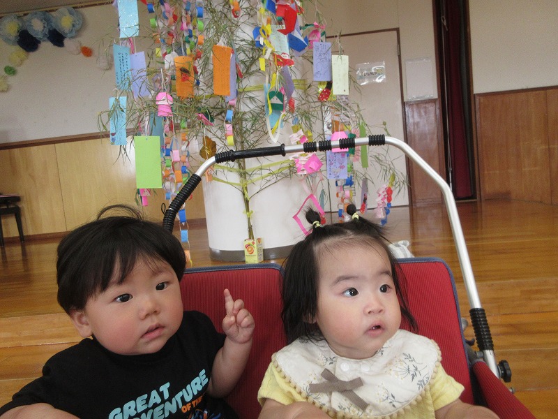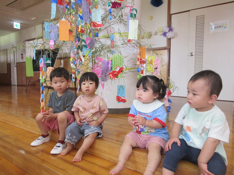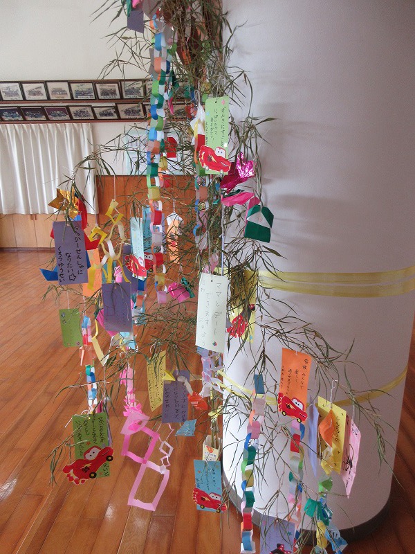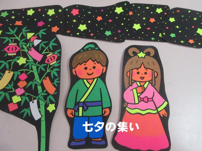 今日は令和7年7月7日、7が三つ揃う七夕だと朝のニュースでも伝えていました。空模様は現在曇り…。夜は星が見えるといいですね。空を見上げてみて下さい。保育園では、蛍光カラーパネルシアターで七夕のお話をしました。暗くして行うことで光るので、子ども達も興味津々に見てくれました。笹につけた子供たちのお願い事、願いが届くといいですね。終わった後は、夏祭りに向けて、みんなで盆踊りの練習を楽しく行いました。 |
