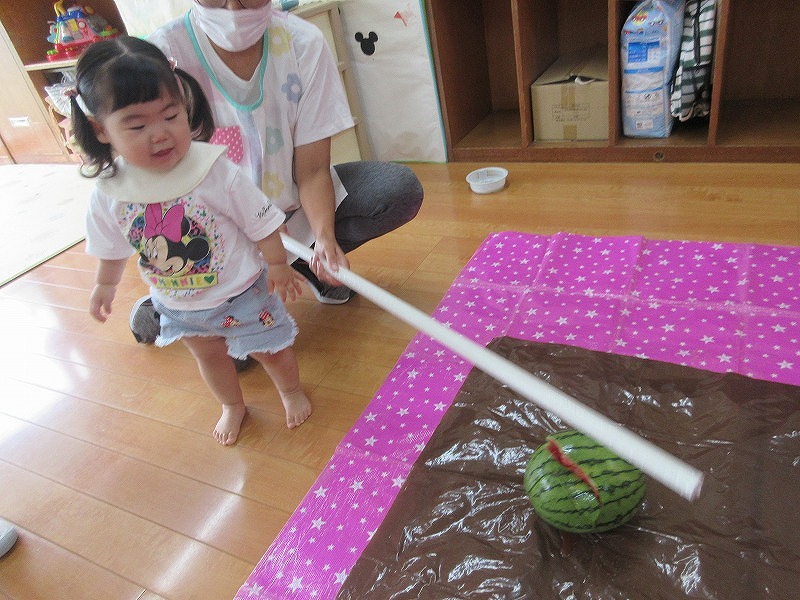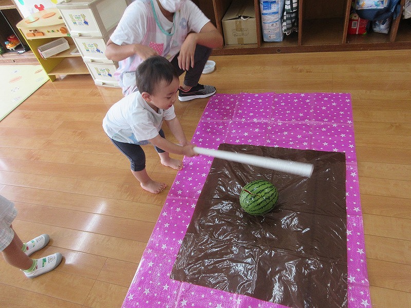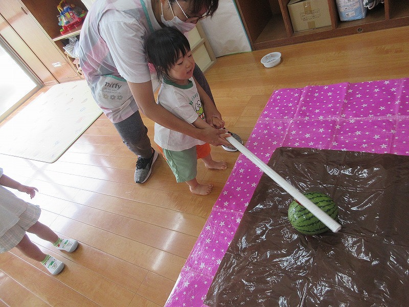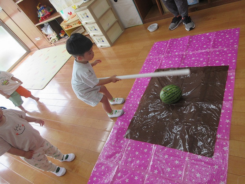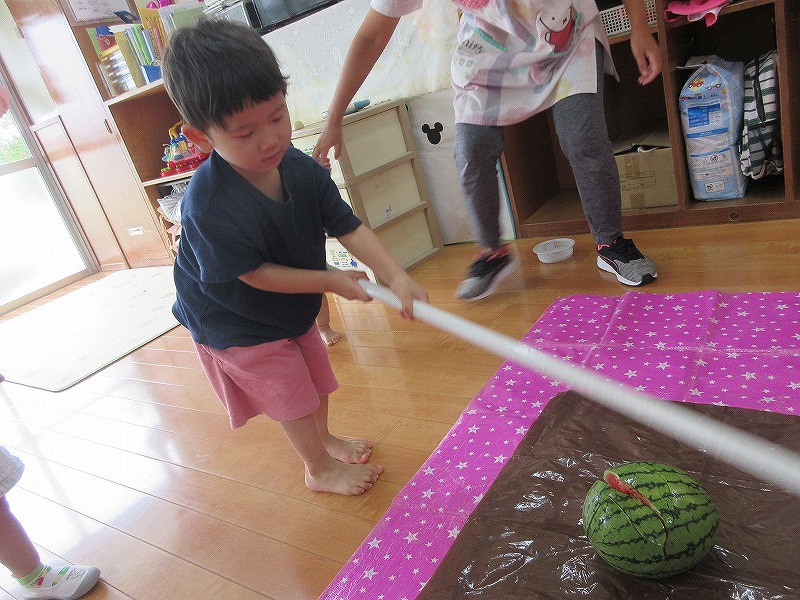 うさぎ組さんが育ててくれたすいかを頂き、すいか割りをしました。「えいっ!」と、すいかを棒で叩く子ども達。