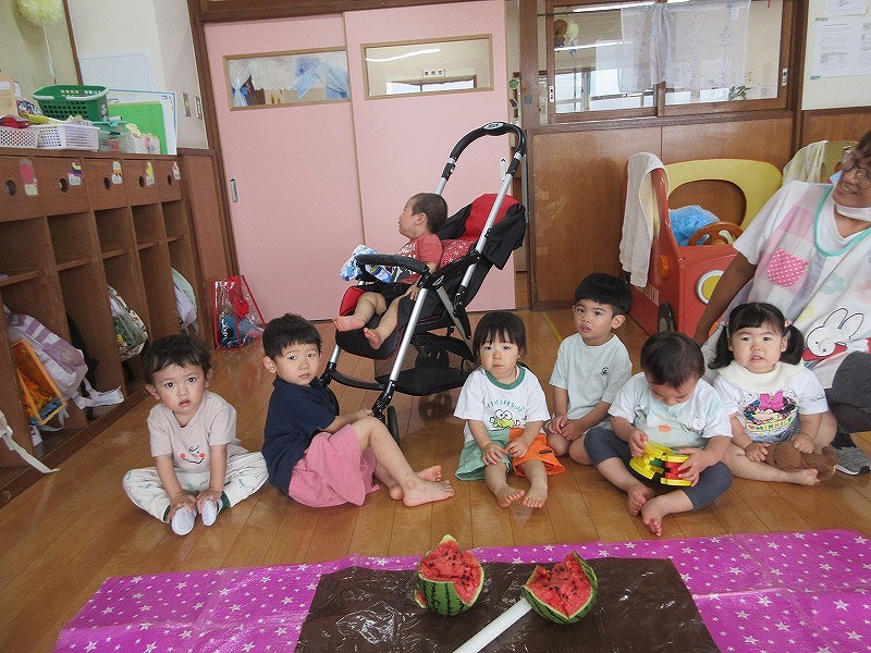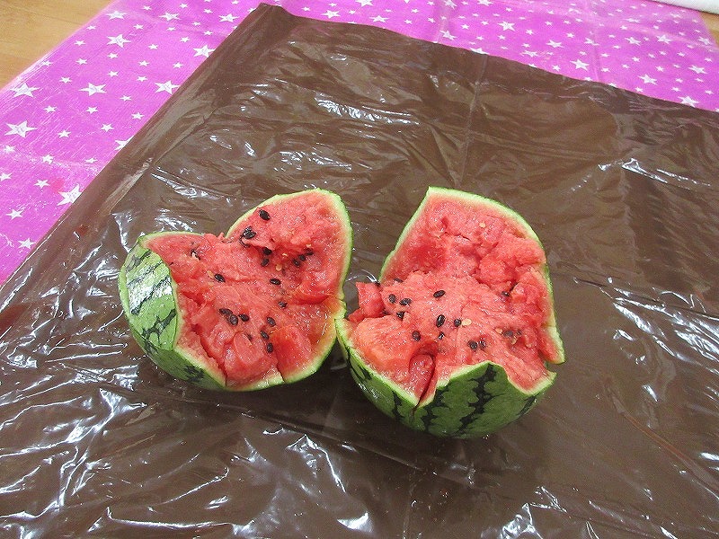 みんなで割ったすいかはとっても甘くて、笑顔もはじけていました!うさぎ組さん、美味しいすいかご馳走様でした!
