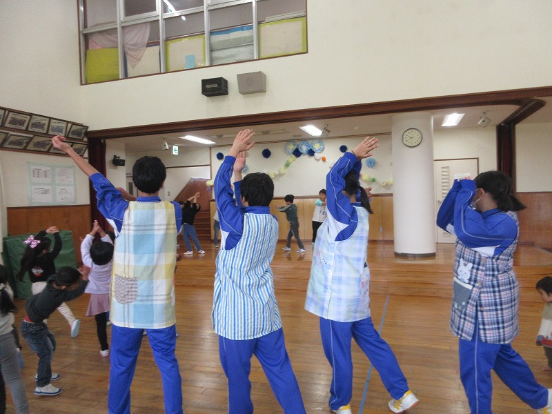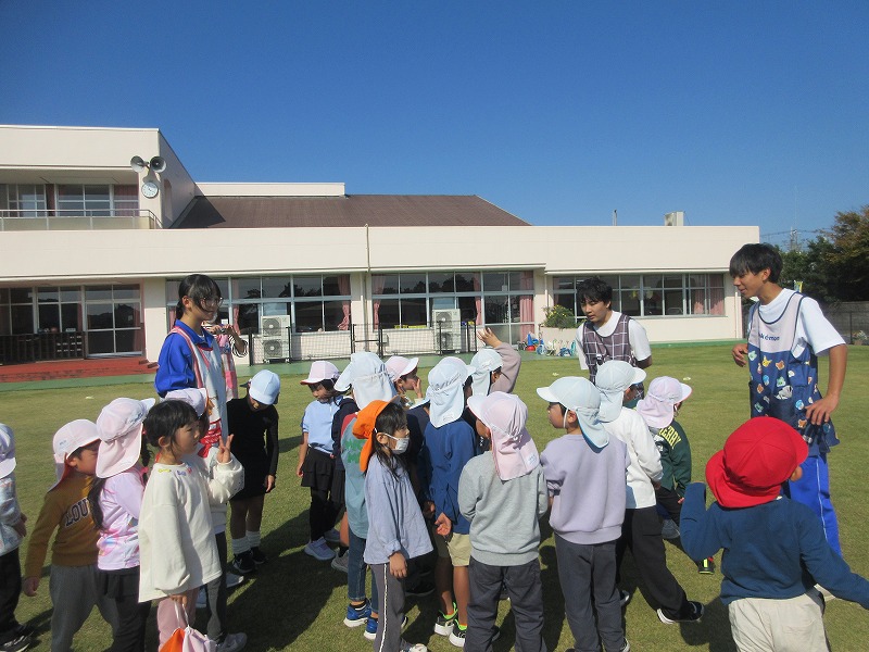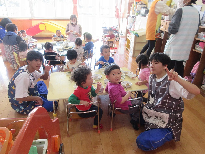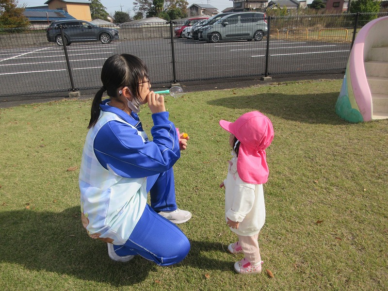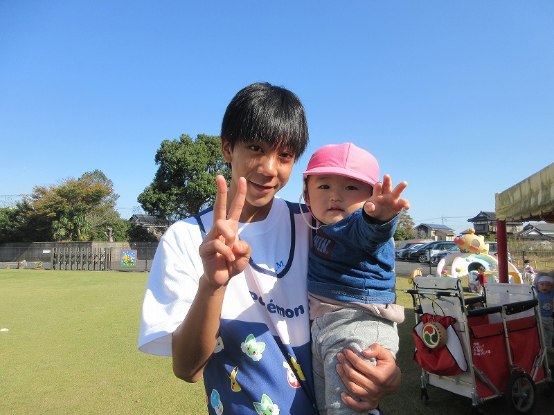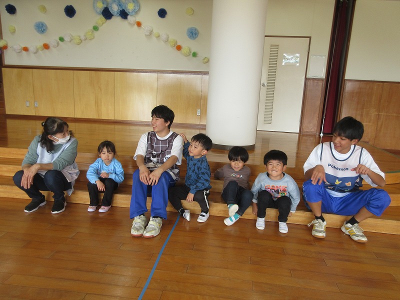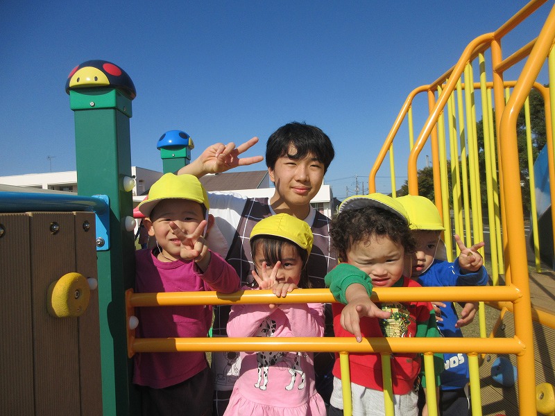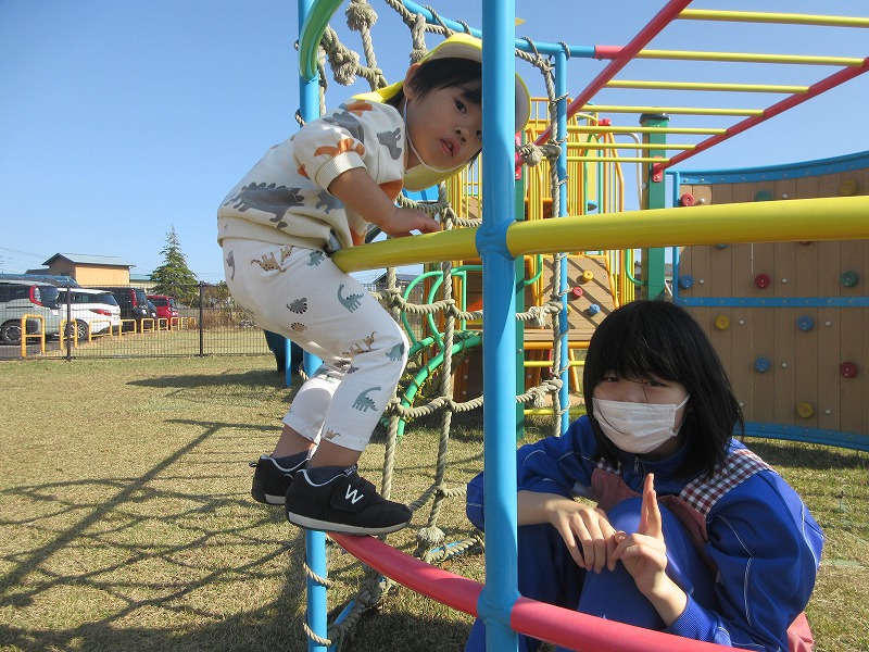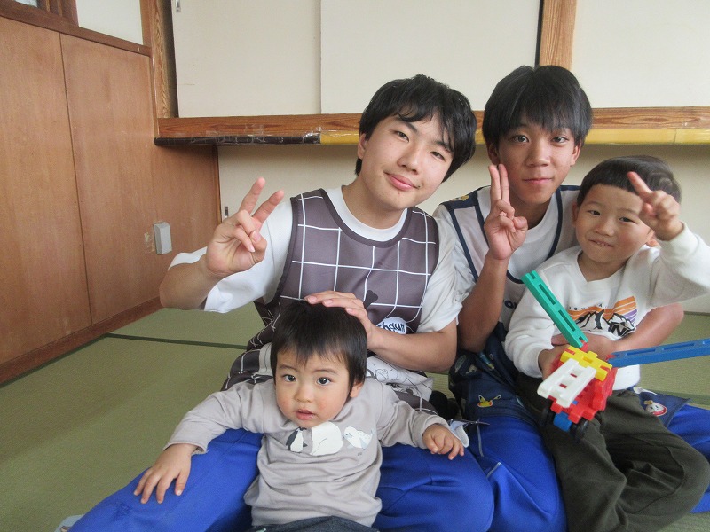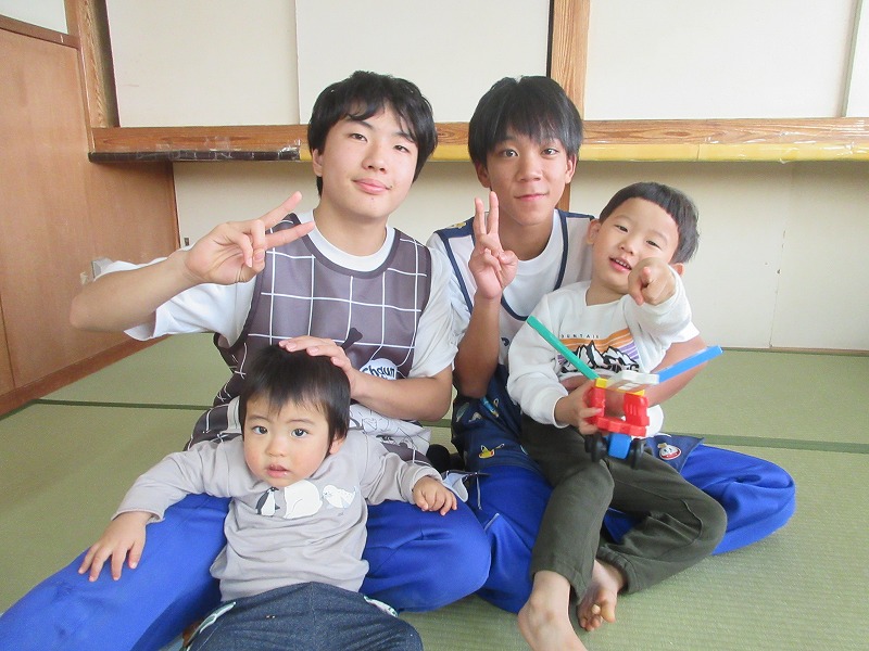 中学生のお兄さん、お姉さん5名が社会体験学習で3日間保育園に来ました。「おにいちゃん」「おねえちゃん」と喜ぶ子ども達。最終日には、お天気の良い中、お散歩やお外遊びを楽しみました!鬼ごっこでは元気な声が園庭に響いていました。中学生の皆さんも、8年前は自分達も園児でしたが、時が経つのは早いものですね。とてもよく笑顔で子ども達と関わってくれ、素敵なお兄さんお姉さんになりました。中学生の皆さんが帰る時、寂しさから涙を流す子もいましたね。3日間ありがとうございました!中学校でも勉強に部活頑張って下さい。 |