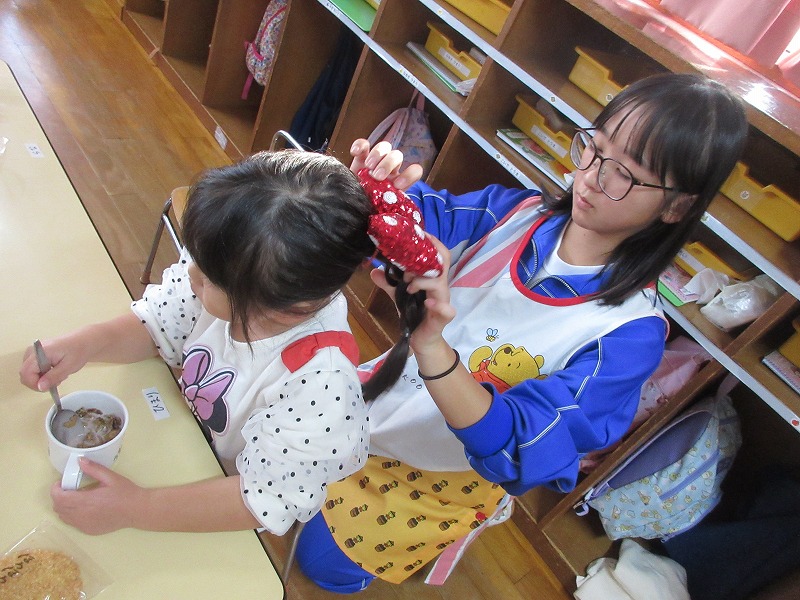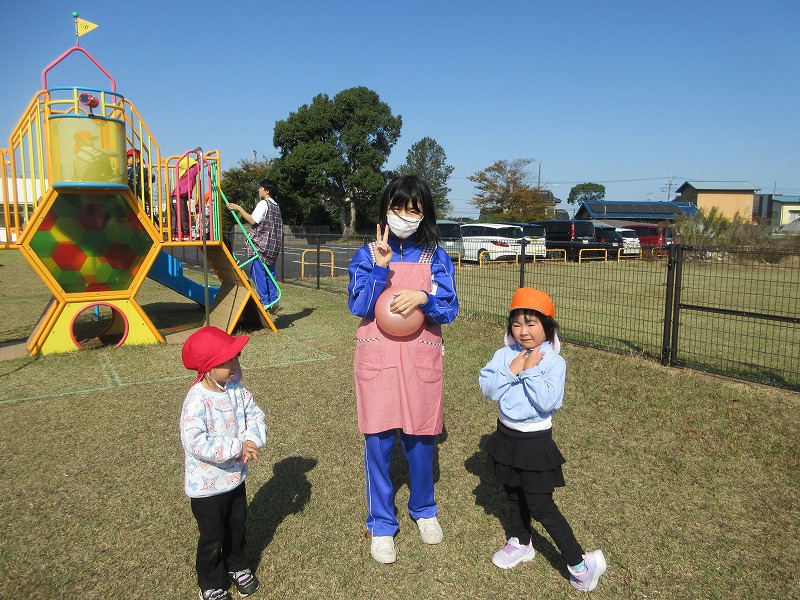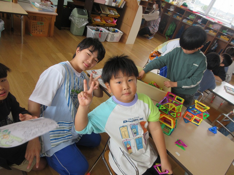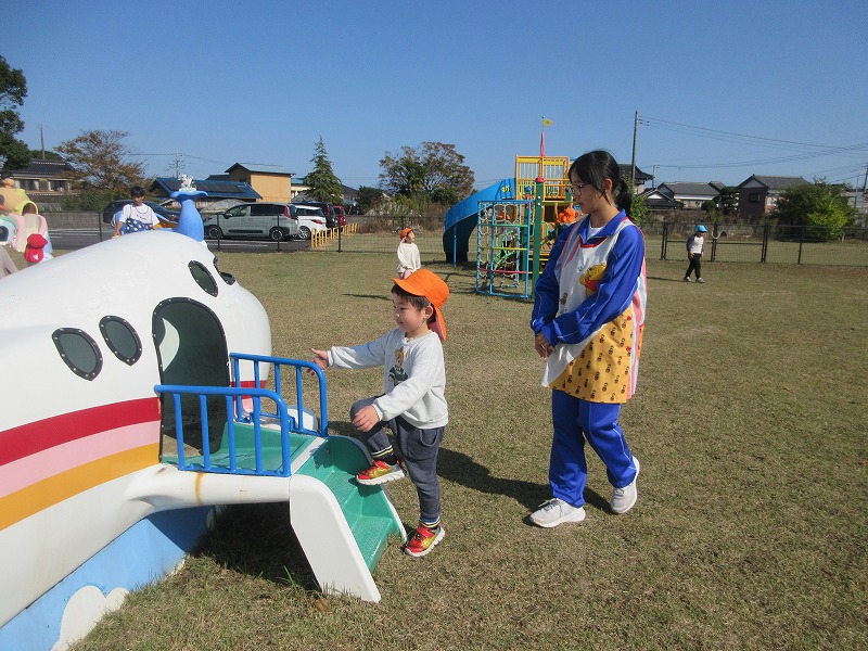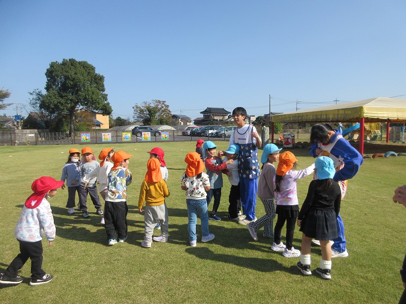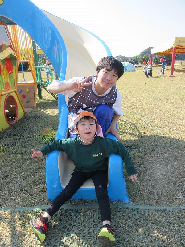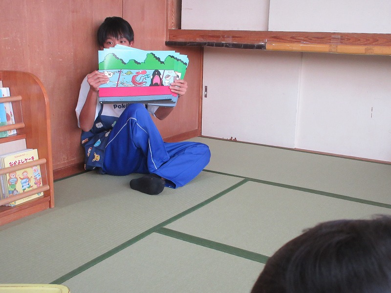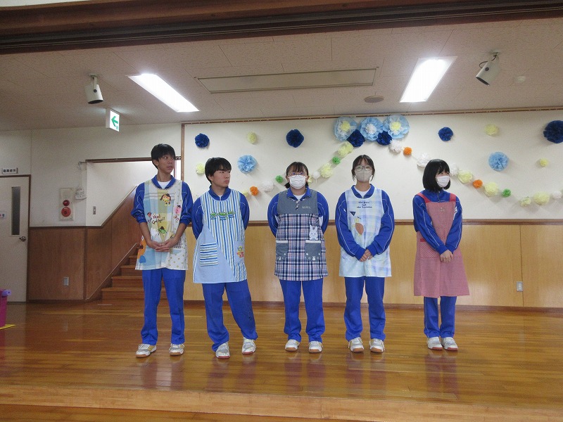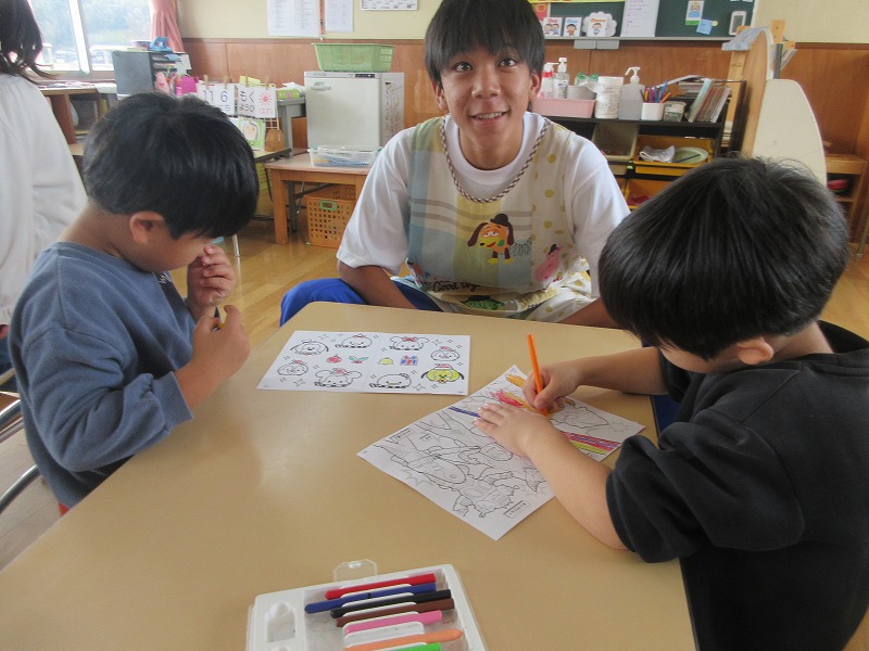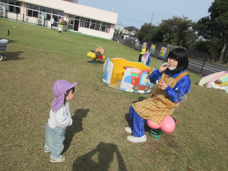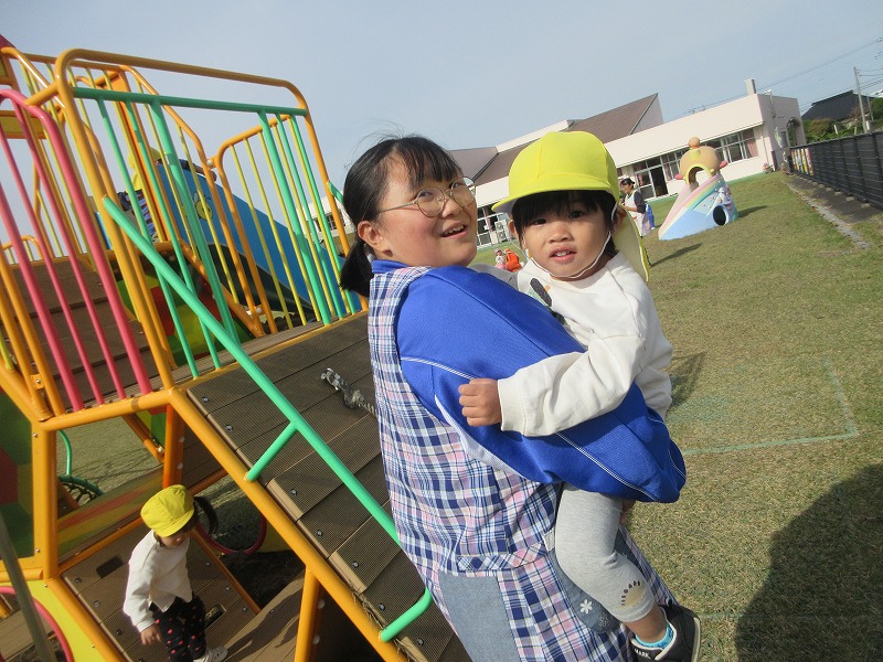 中学生のお兄さん、お姉さん5名が社会体験学習で3日間保育園に来ました。「おにいちゃん」「おねえちゃん」と喜ぶ子ども達。最終日には、お天気の良い中、お散歩やお外遊びを楽しみました!鬼ごっこでは元気な声が園庭に響いていました。中学生の皆さんも、8年前は自分達も園児でしたが、時が経つのは早いものですね。とてもよく笑顔で子ども達と関わってくれ、素敵なお兄さんお姉さんになりました。中学生の皆さんが帰る時、寂しさから涙を流す子もいましたね。3日間ありがとうございました!中学校でも勉強に部活頑張って下さい。 |
