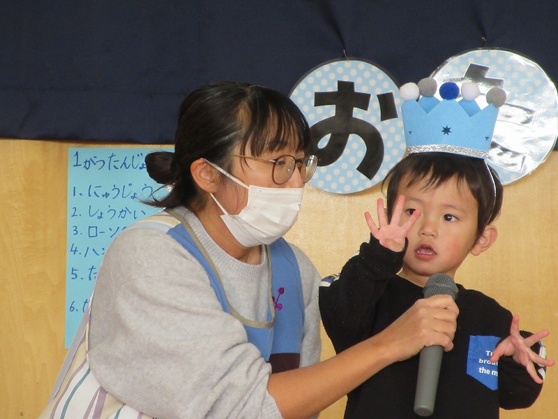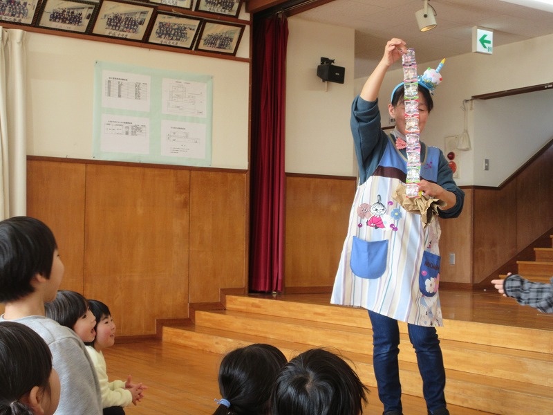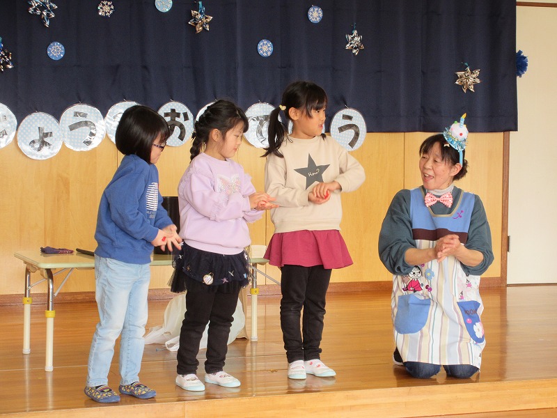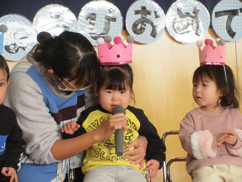 今日は1月の誕生会がホールで行われました。1月生まれの7名のお友達は元気にインタビューにも答えられ、みんなにたくさんお祝いしてもらい嬉しそうでした。そして、今月の出し物は手品♪興味津々な子ども達は、「おー!」と歓声をあげながら楽しんでいました。ご参加頂いた保護者の皆様、ありがとうございました。