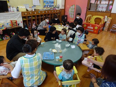 未満児「おやつの時の姿を見て頂き、ホールで遊びました」