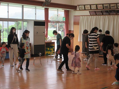 3歳児「ホールで椅子取りゲーム等をしました」