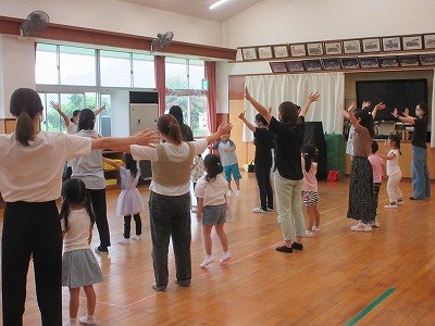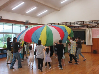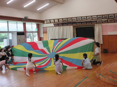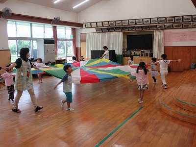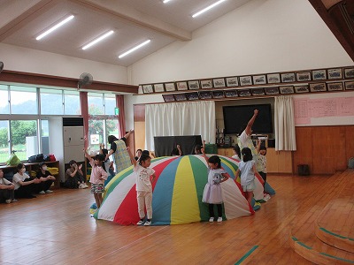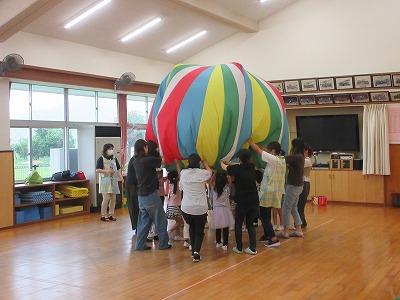 5歳児「ホールで親子でバルーンをしました」