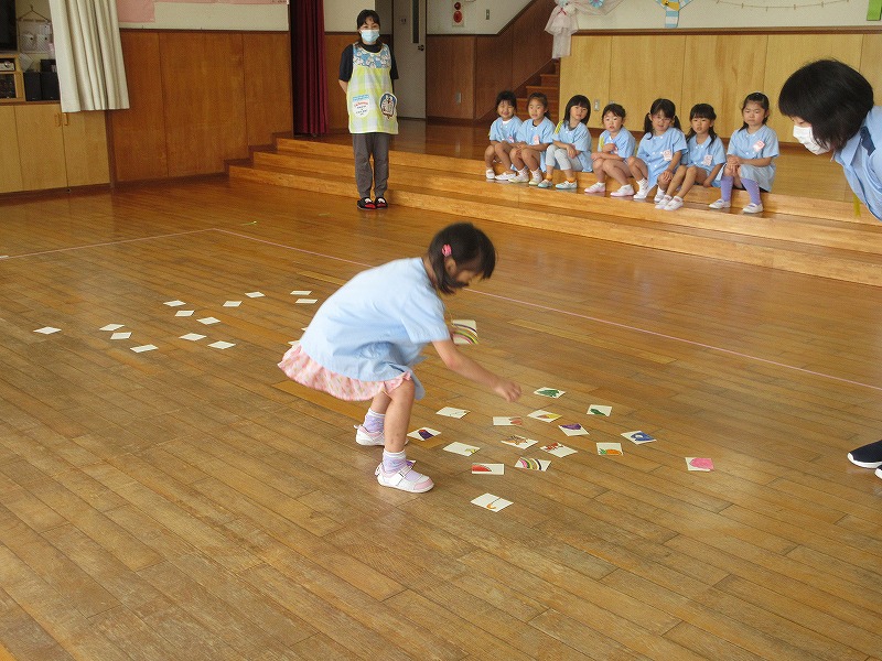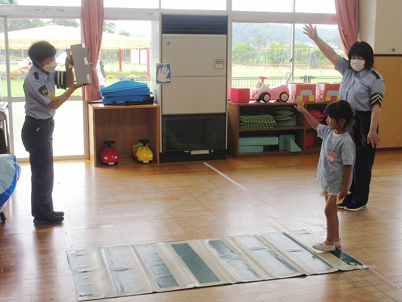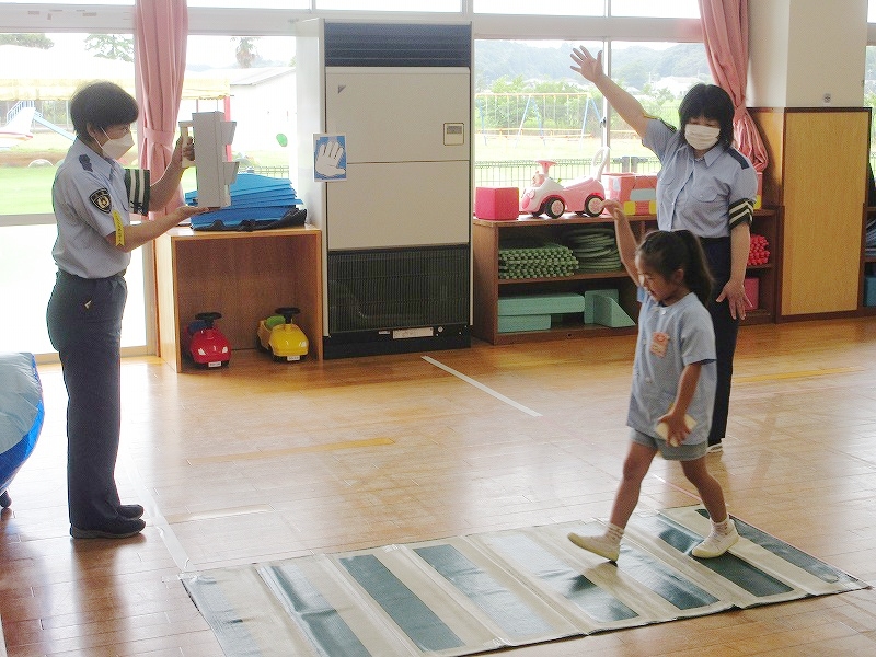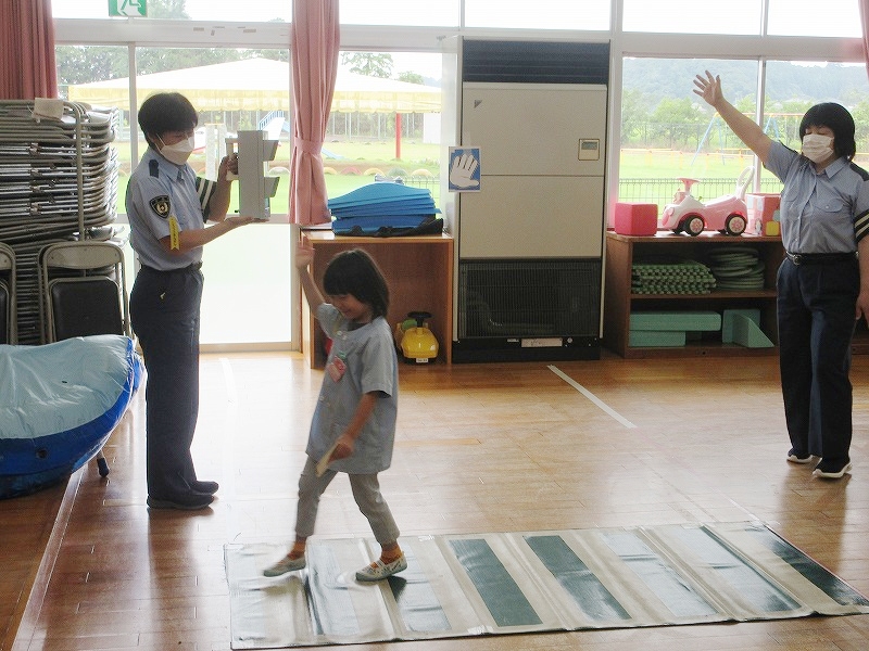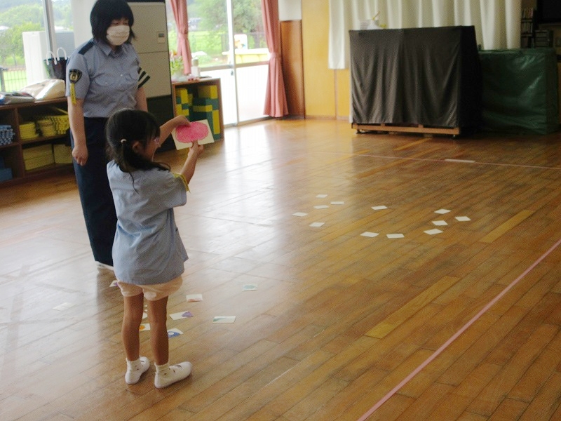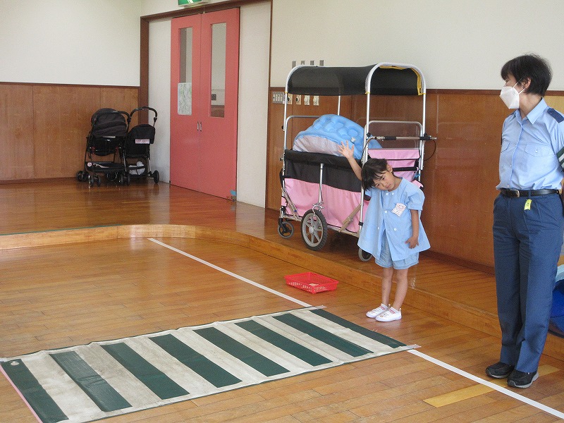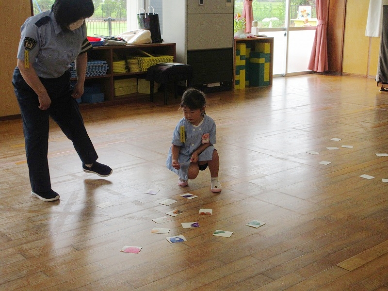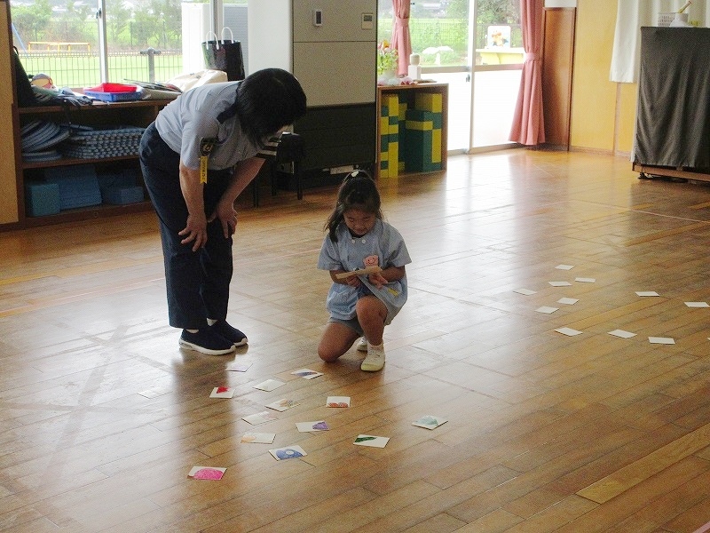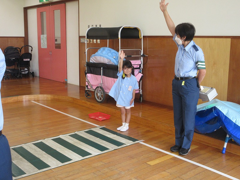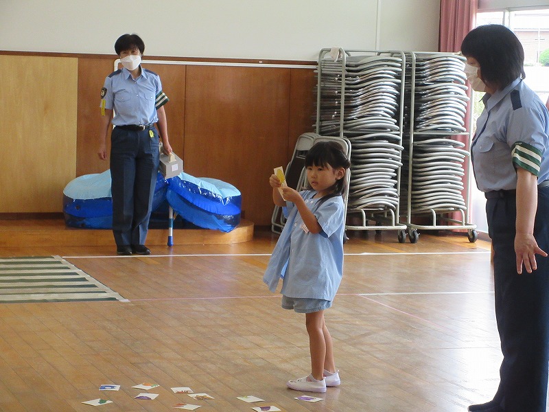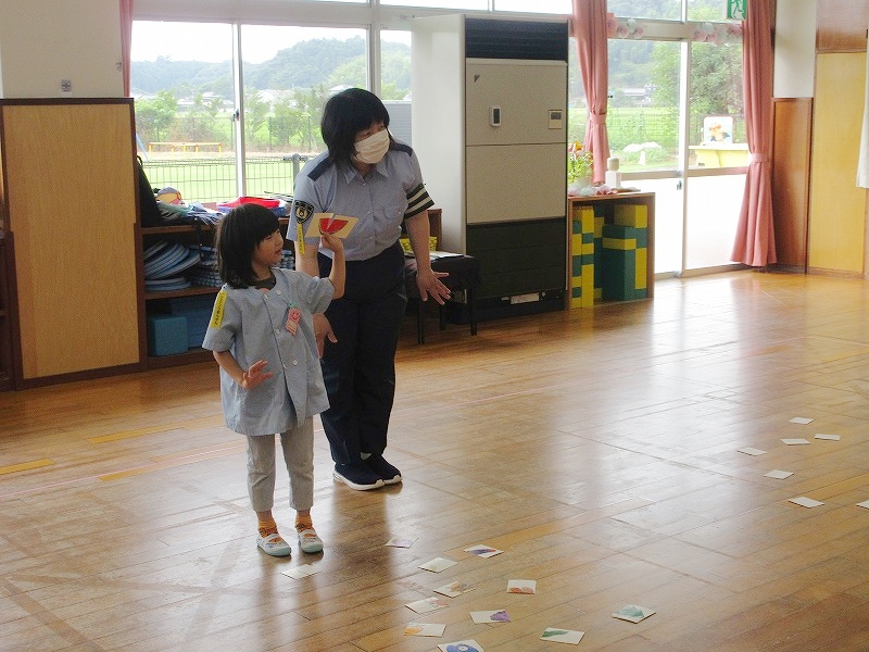 緊急車両の確認をしました。その後で、絵合わせゲームをしながら横断歩道の渡り方を一人ずつ練習しました。