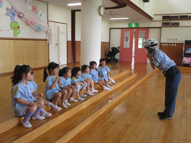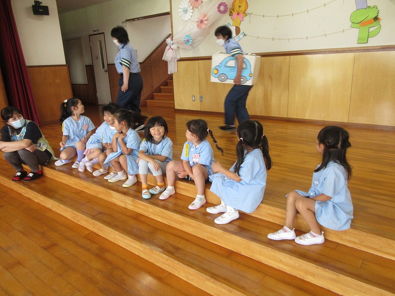 今日は第二回目の交通安全教室がありました。エプロンシアターで信号機のある横断の仕方を教えてもらったり、
