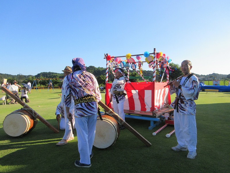 小学生が神輿を担いでいる時は小見下座保存会の皆様に太鼓と笛で演奏もしていただき、お祭りの雰囲気も