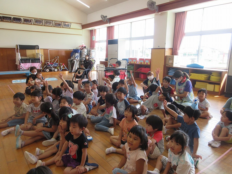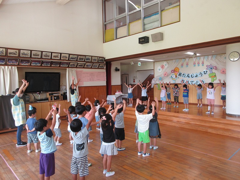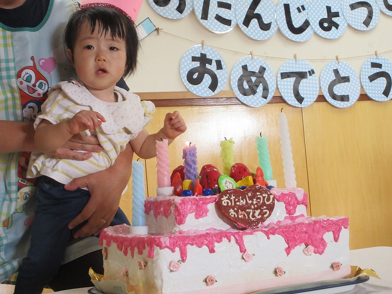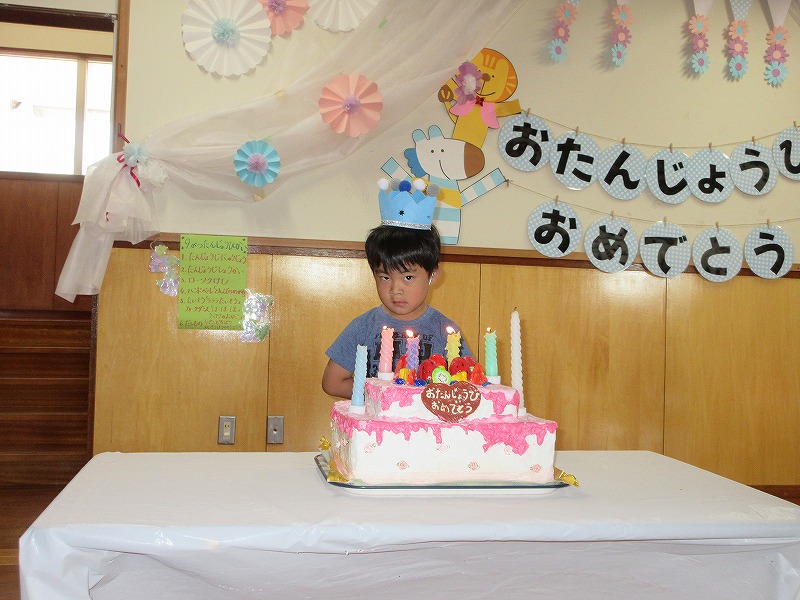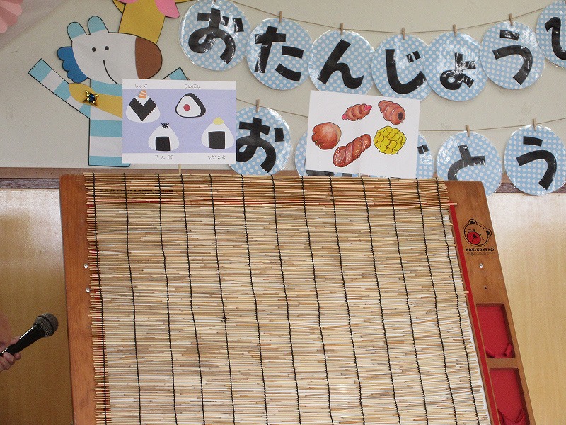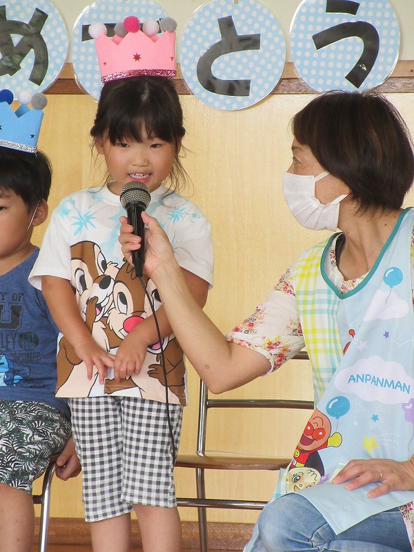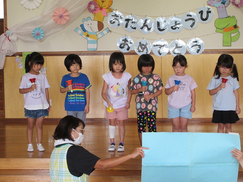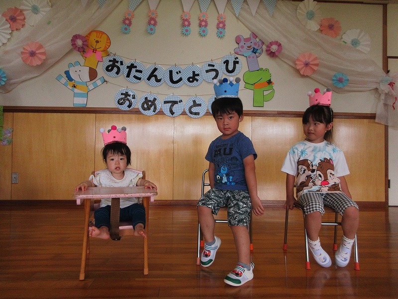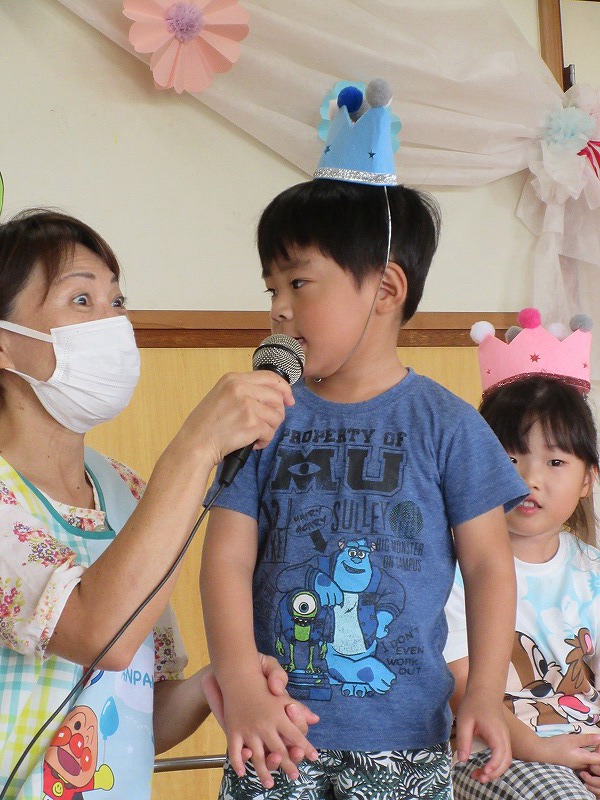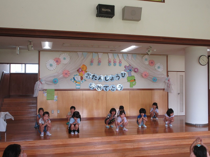 昨日は十五夜できれいな満月が見られましたね。今日は9月のお誕生会がありました。誕生児のお友達はインタビューに答えたりローソク消し、みんなにお祝いしてもらい嬉しそうな様子でした。