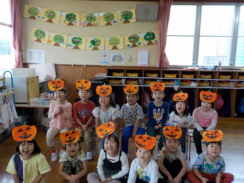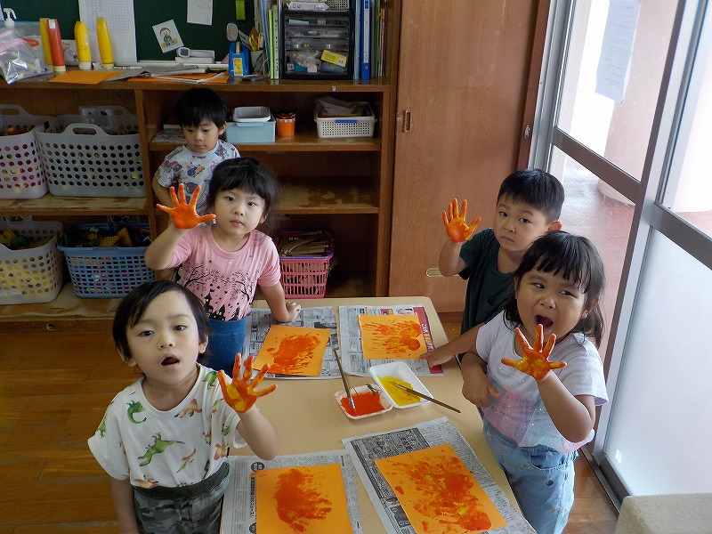 室内ではハロウィン製作を楽しみました。手を絵の具でいっぱいにし、ペタペタ手形スタンプ!かわいいお化けカボチャ