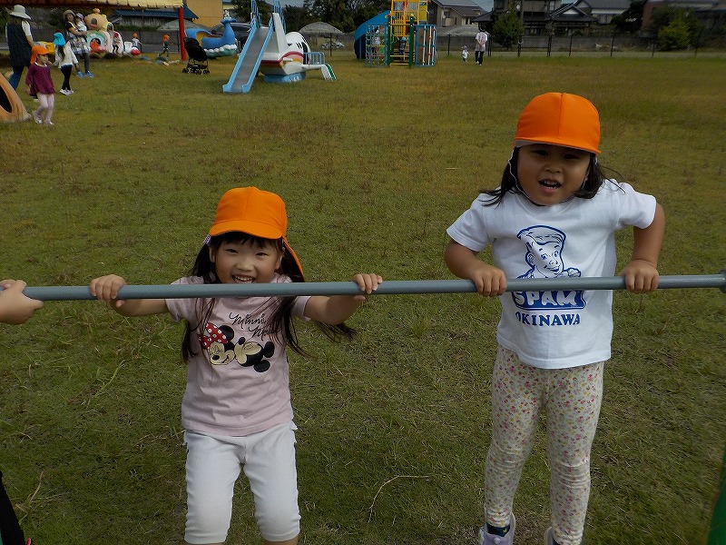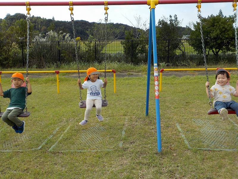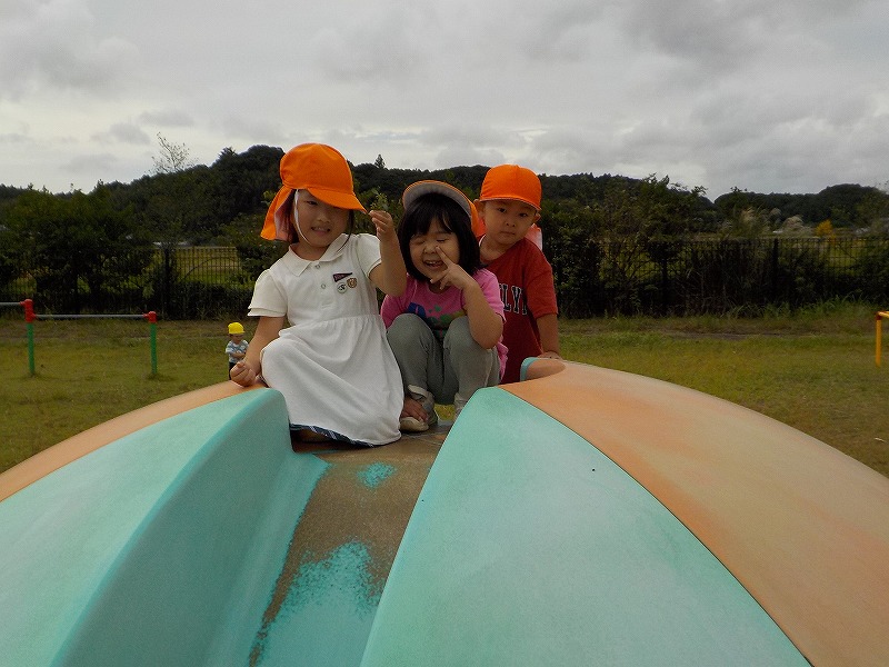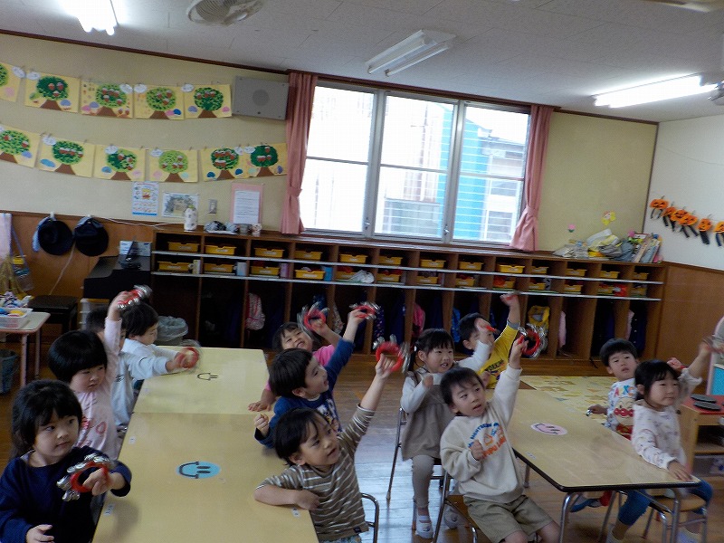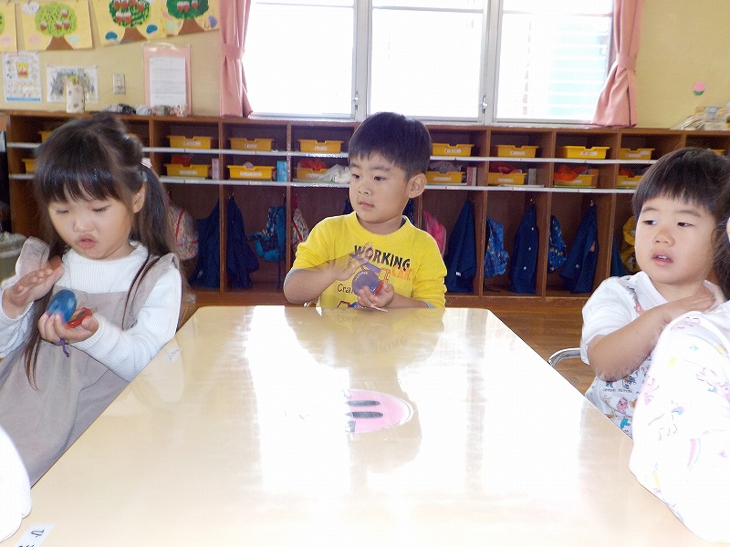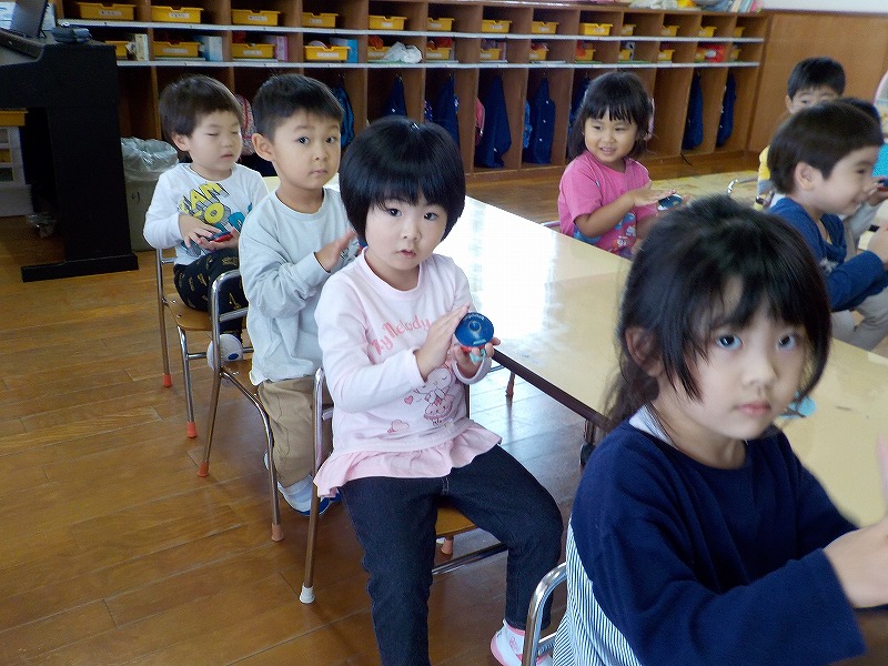 の出来上がり♡ 戸外では走ることが大好きで毎日勢いよく、かけっこ・追いかけっこを楽しんでいます。鉄棒、ブランコも大好きです!また、12月の発表会に向けて楽器遊びも始めました。楽器の音色を楽しみ喜ぶ子ども達です! |